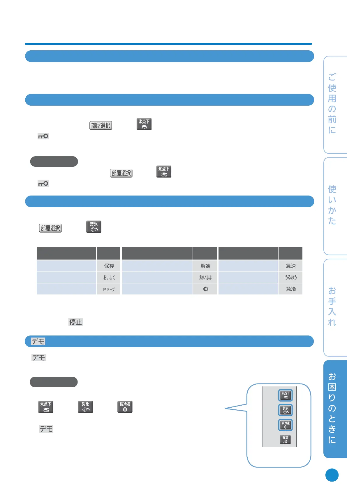 が点灯しているときは、デモ運転状態です。デモ運転状態では冷蔵庫は冷えません。お買上げの販売店へ