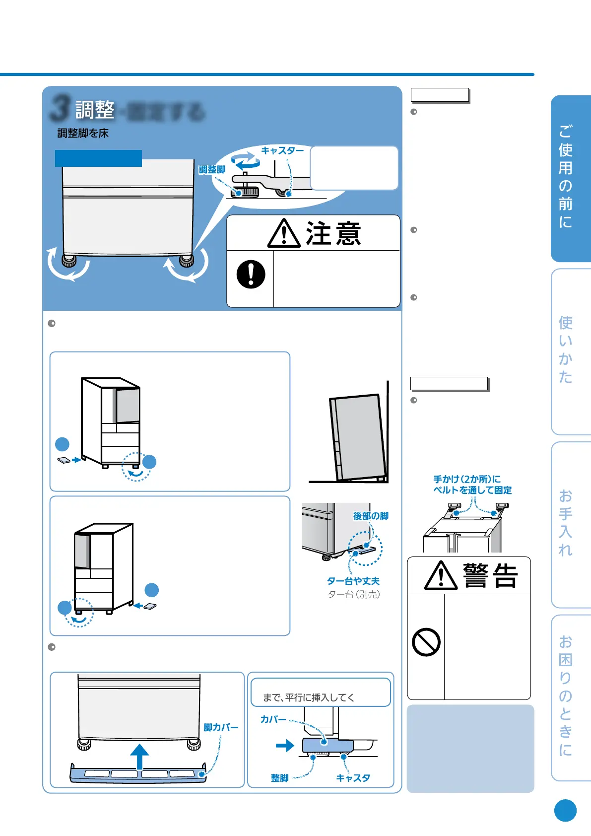 設置から数日後、重みで床が沈むことがあります。調整脚で傾きを再調整してください。
