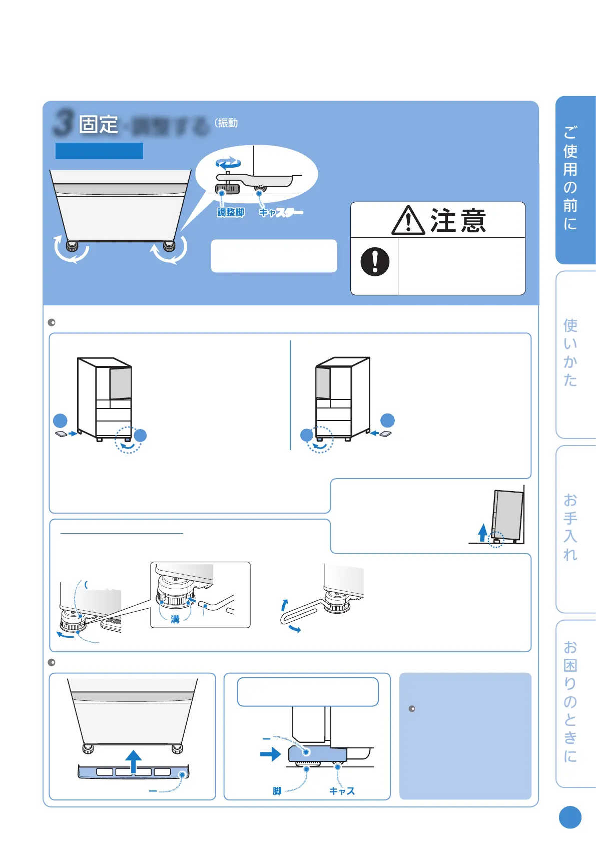 調整後、脚カバーを取り付けてください。(脚カバーは出荷時冷蔵室内に同梱されています)