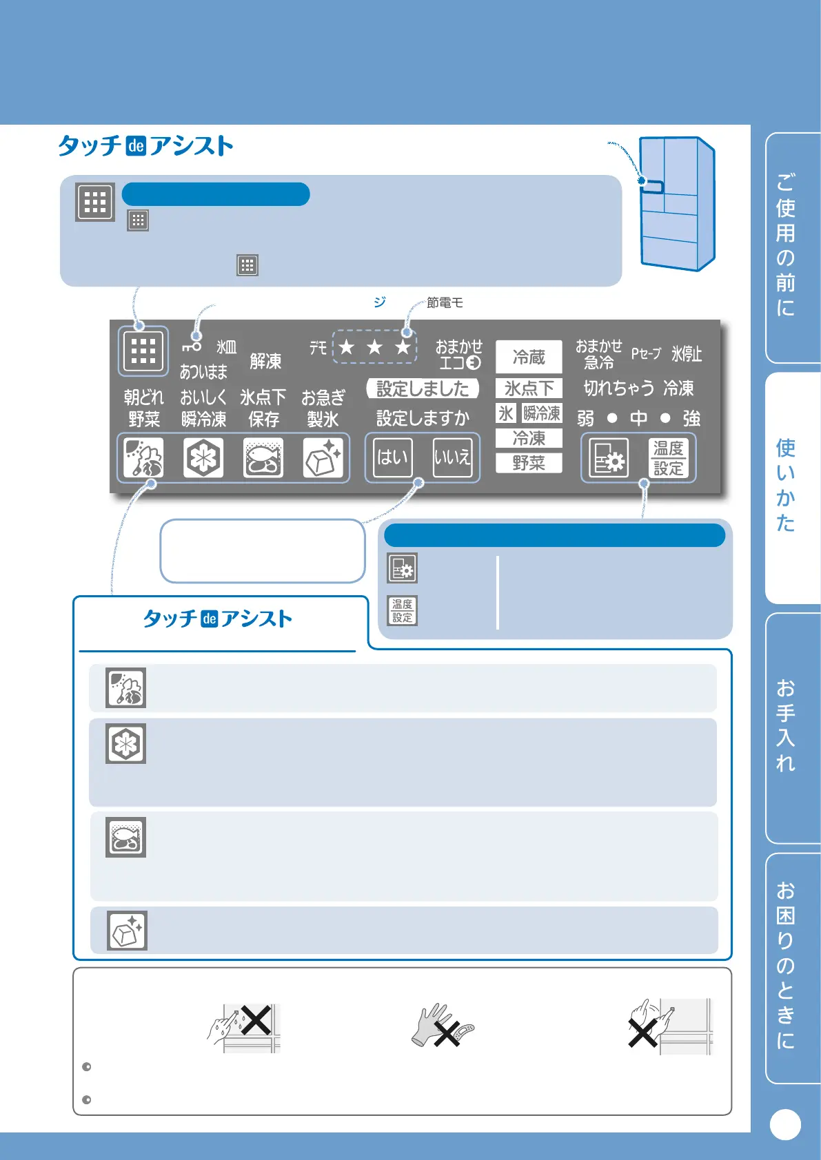 操作は手で行い、タッチした後は、表示が変わっていることを確認してから再度タッチしてください。
