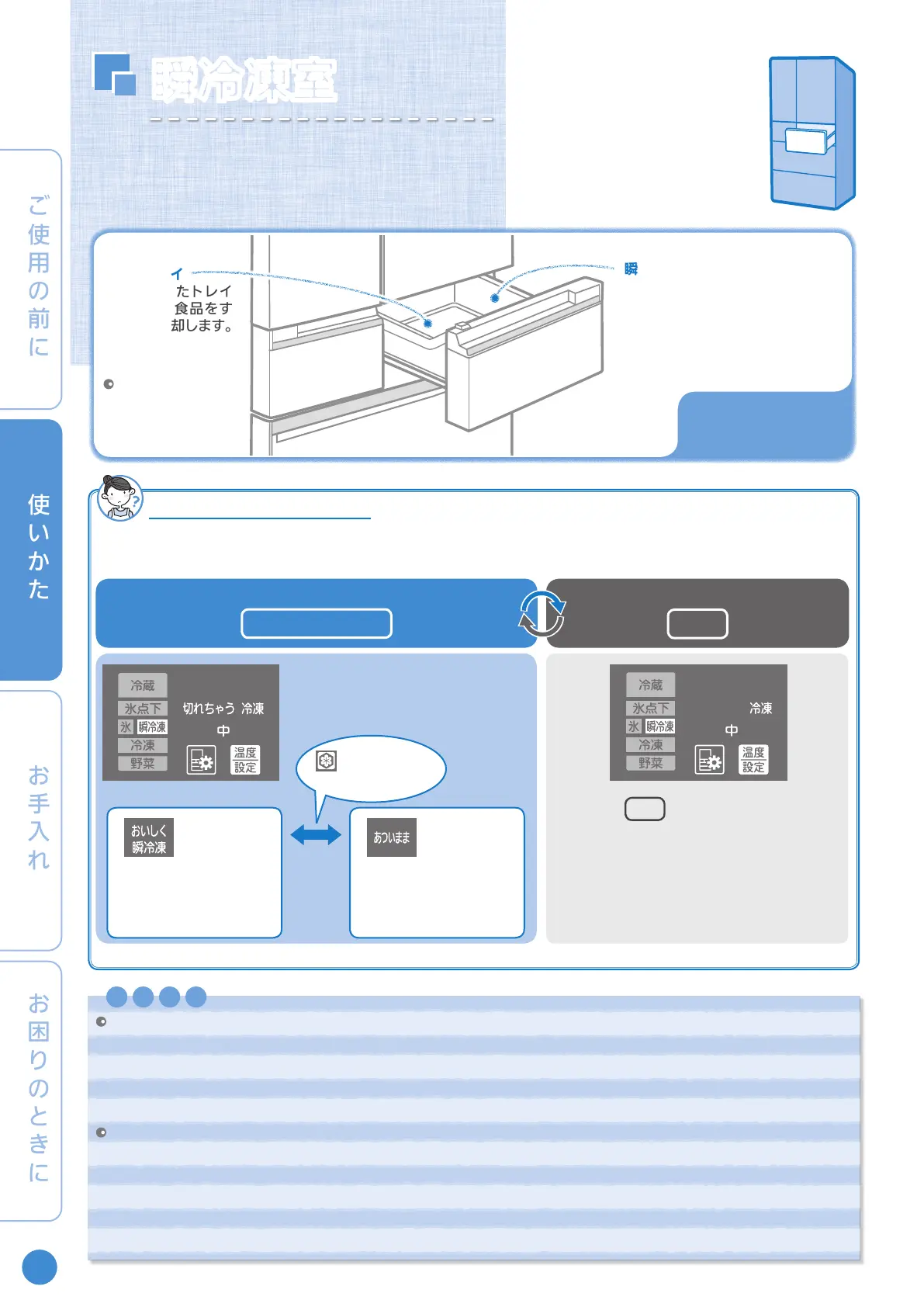 (ご購入時、瞬冷凍室は「切れちゃう冷凍」「 中」に設定されています。切替方法と用途