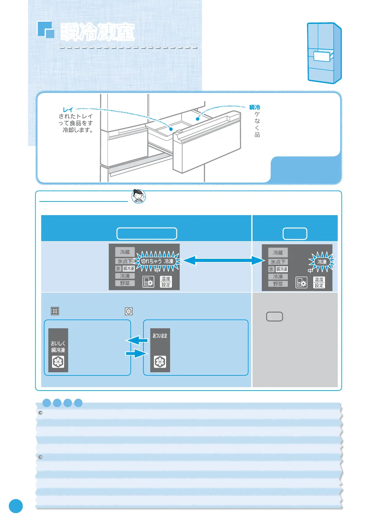 瞬冷凍室は、温度設定を「切れちゃう冷凍」または「冷凍」に切り替えて使用できます。
