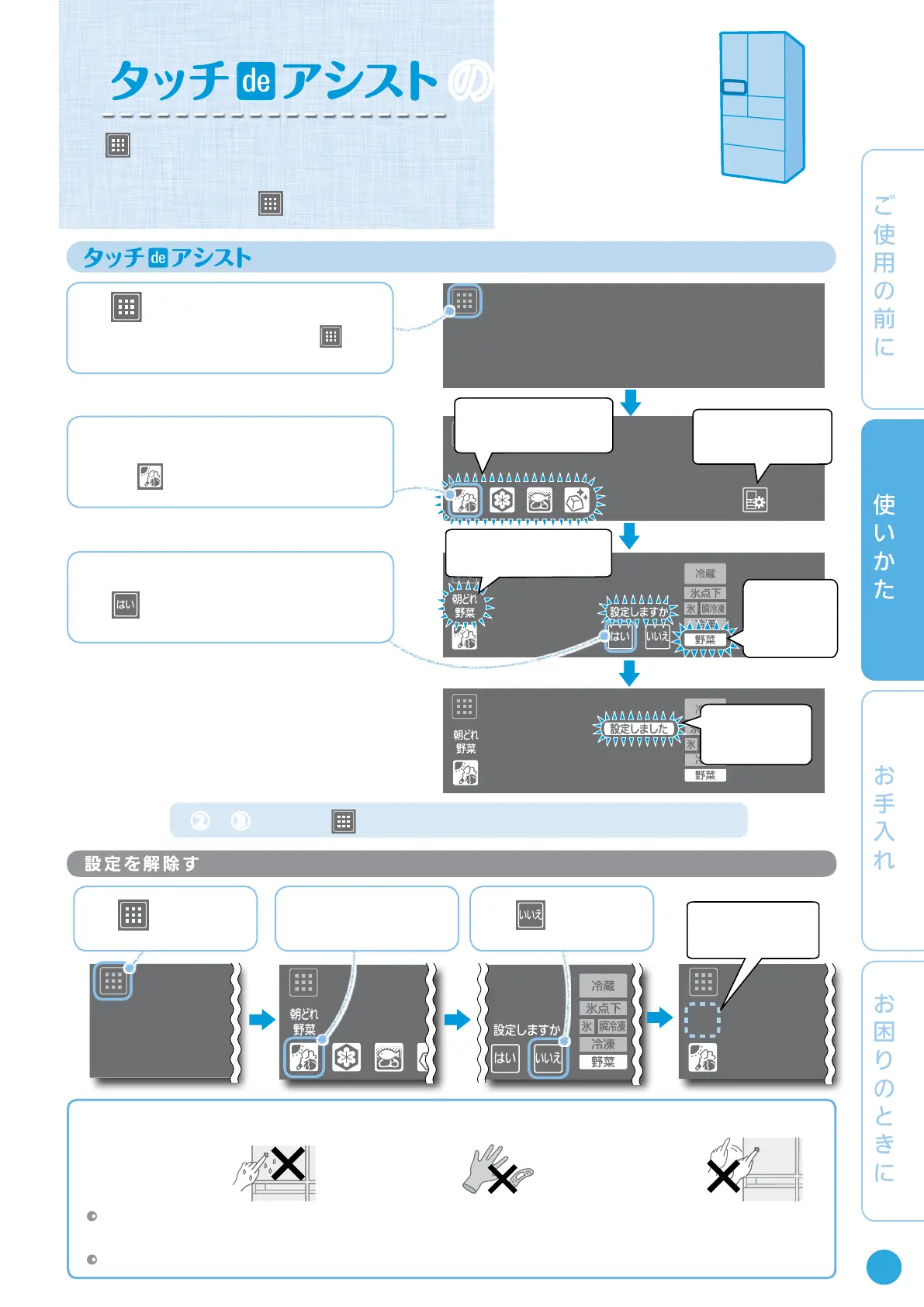 操作は手で行い、タッチした後は、表示が変わっていることを確認してから再度タッチしてください。