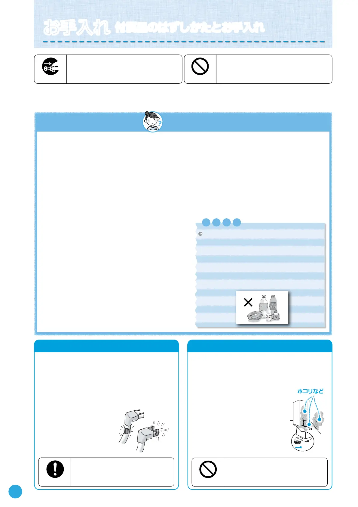 ※お手入れ後、コンセントに再度電源プラグを差し込むときは、10分以上間をおいてから差し込んでください。
