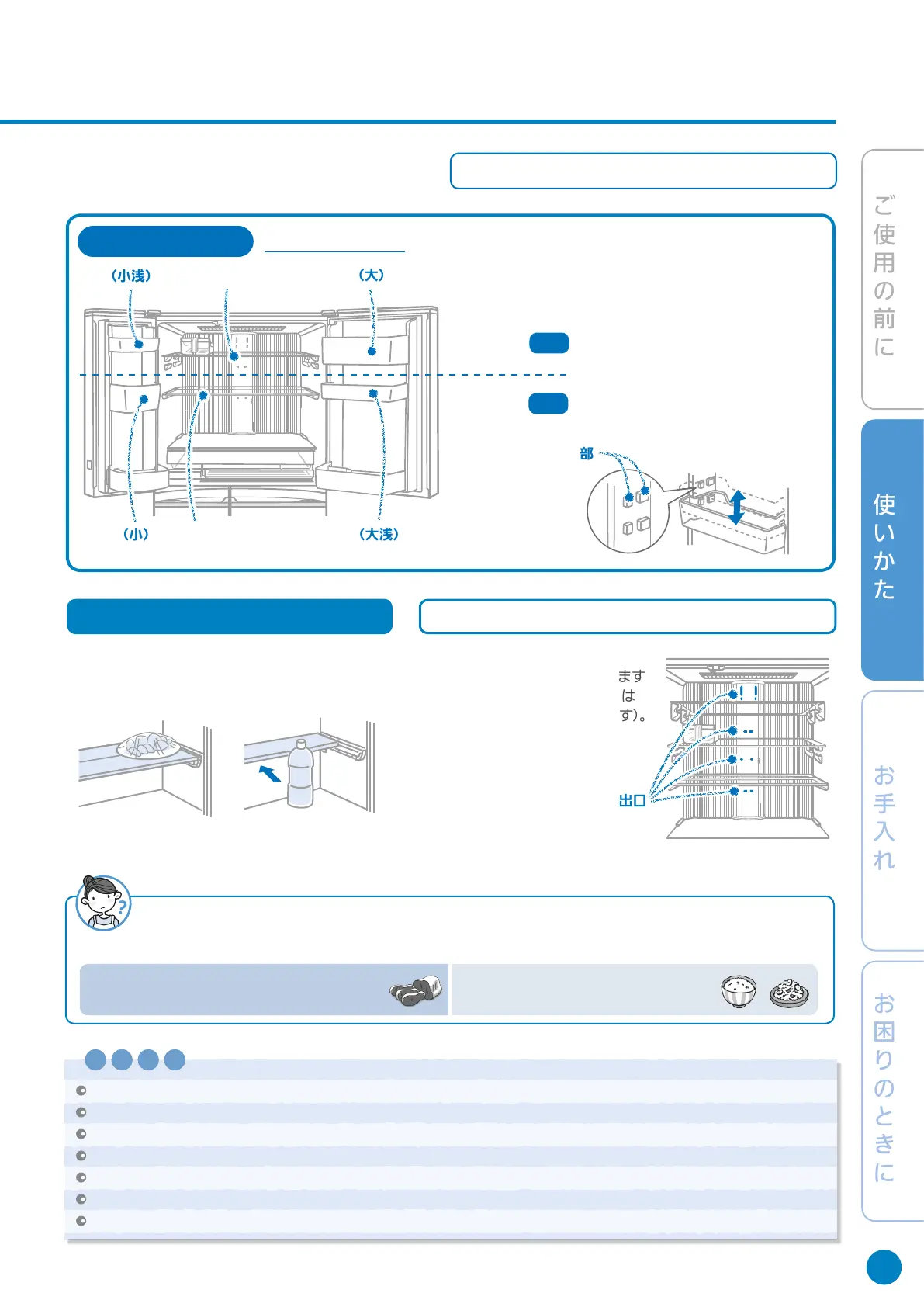 ガラス製の棚が割れたときは、割れたガラスに触れず、すぐにお買上げの販売店または修理窓口にご連絡ください。➡ 43ページ
