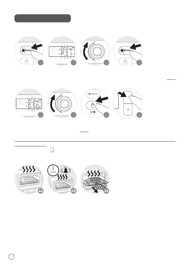 À la fin de la cuisson, le four bipe et s'arrête automatiquement (images 44-45-46).