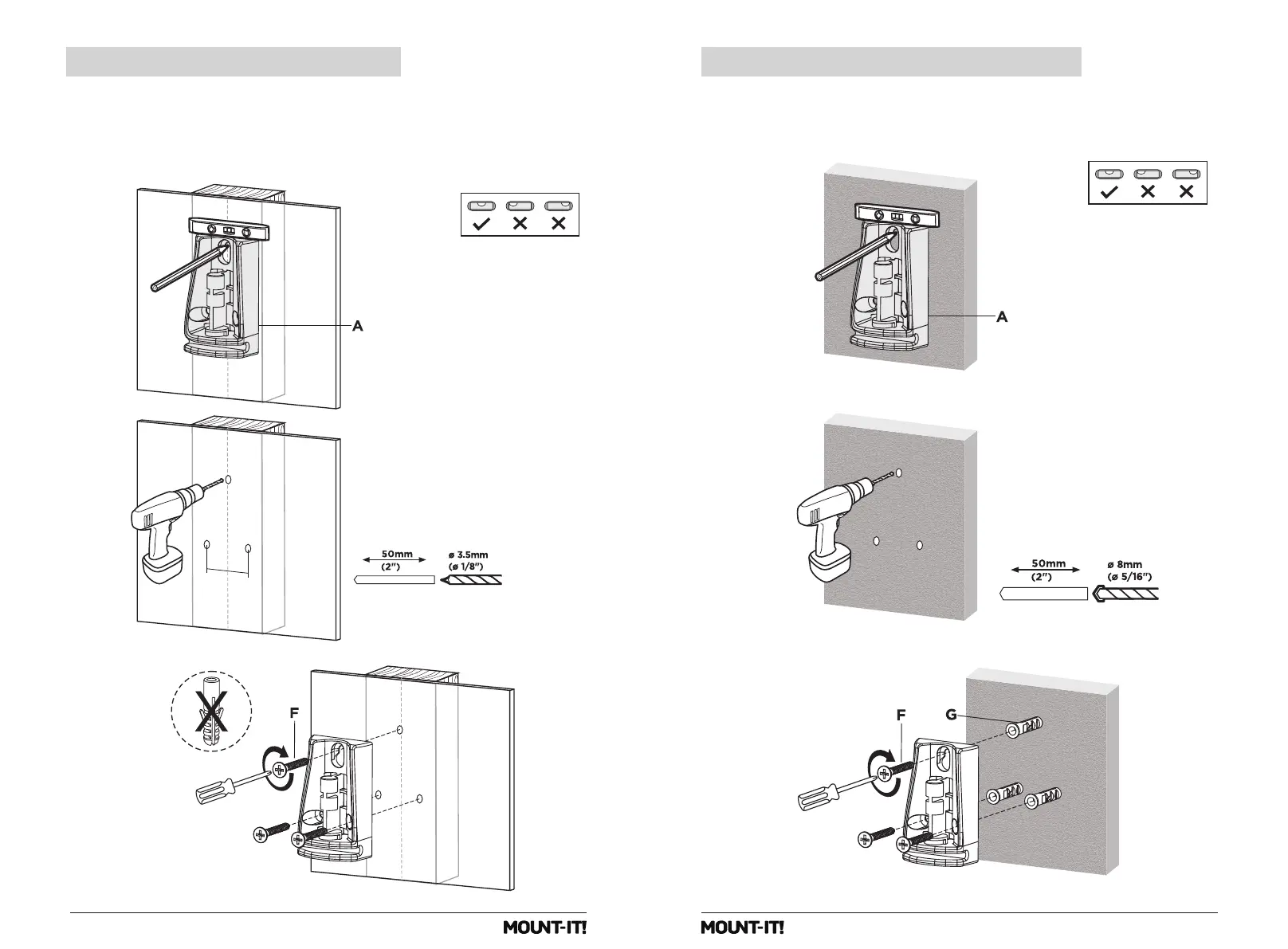 Concrete Anchors (#G) into the holes, then secure the mount to the wall using the Lag Screws (#F).