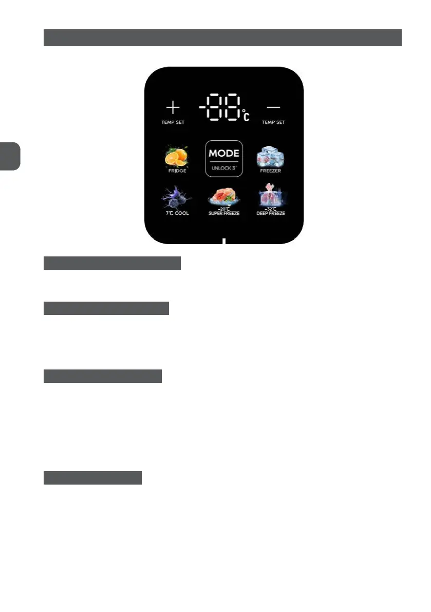 (5°C) - Freezer (-18°C) – Cool (7°C) – Super Freeze(-20°C) – Deep freeze (-32°C)“ can be