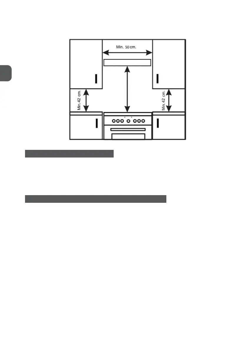4. Place the wall cabinets adjacent to the hood at a minimum height of 42 cm from the hobs as indicated in figure 1.