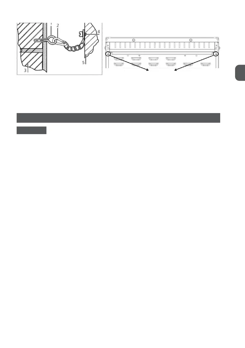 The hooks should be secured to the wall at the rear of the cooker. The chains should always be attached to the hooks when