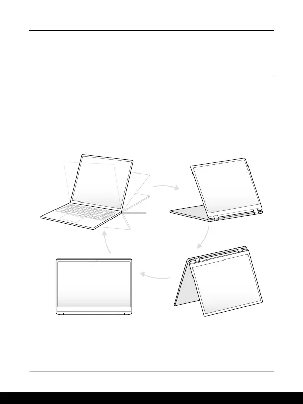 The adjustable rotating display panel with modes of 1.Clamshell/ 2.Stand/ 3.Tent/ 4.Tablet