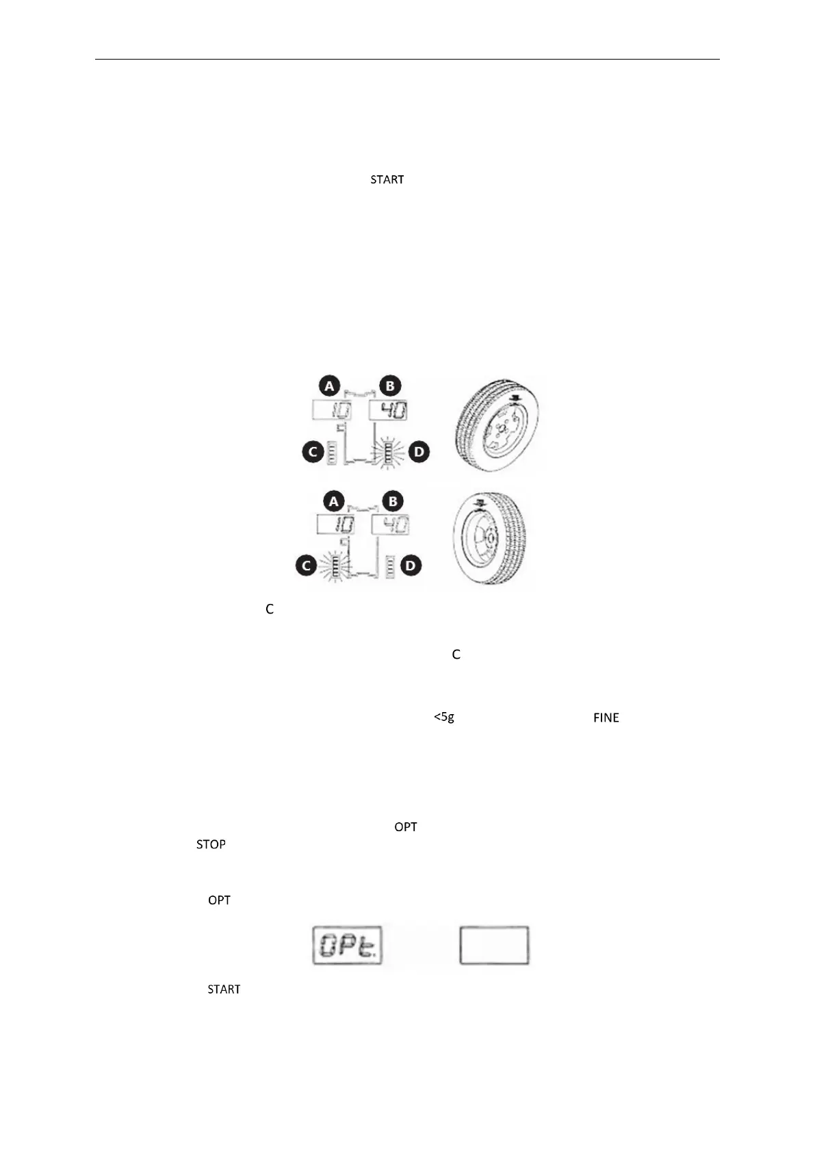 hält das Rad an und die Anzeigen (A) und (B) zeigen die Gewichte an, die zum Auswuchten des Reifens