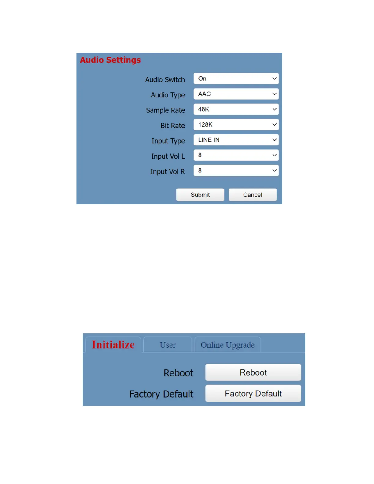 1) Initialize: The user can perform a reboot or a factory default of the camera.