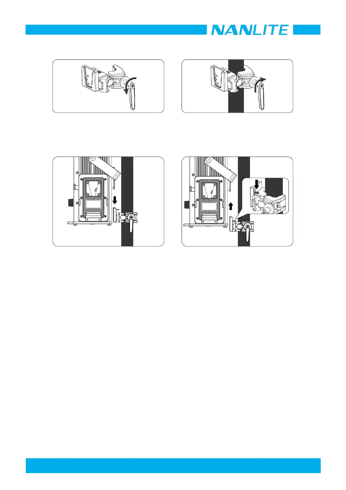 (1) Rotate the adjustable handle to release the (2) Mount the quick release clamp on the light