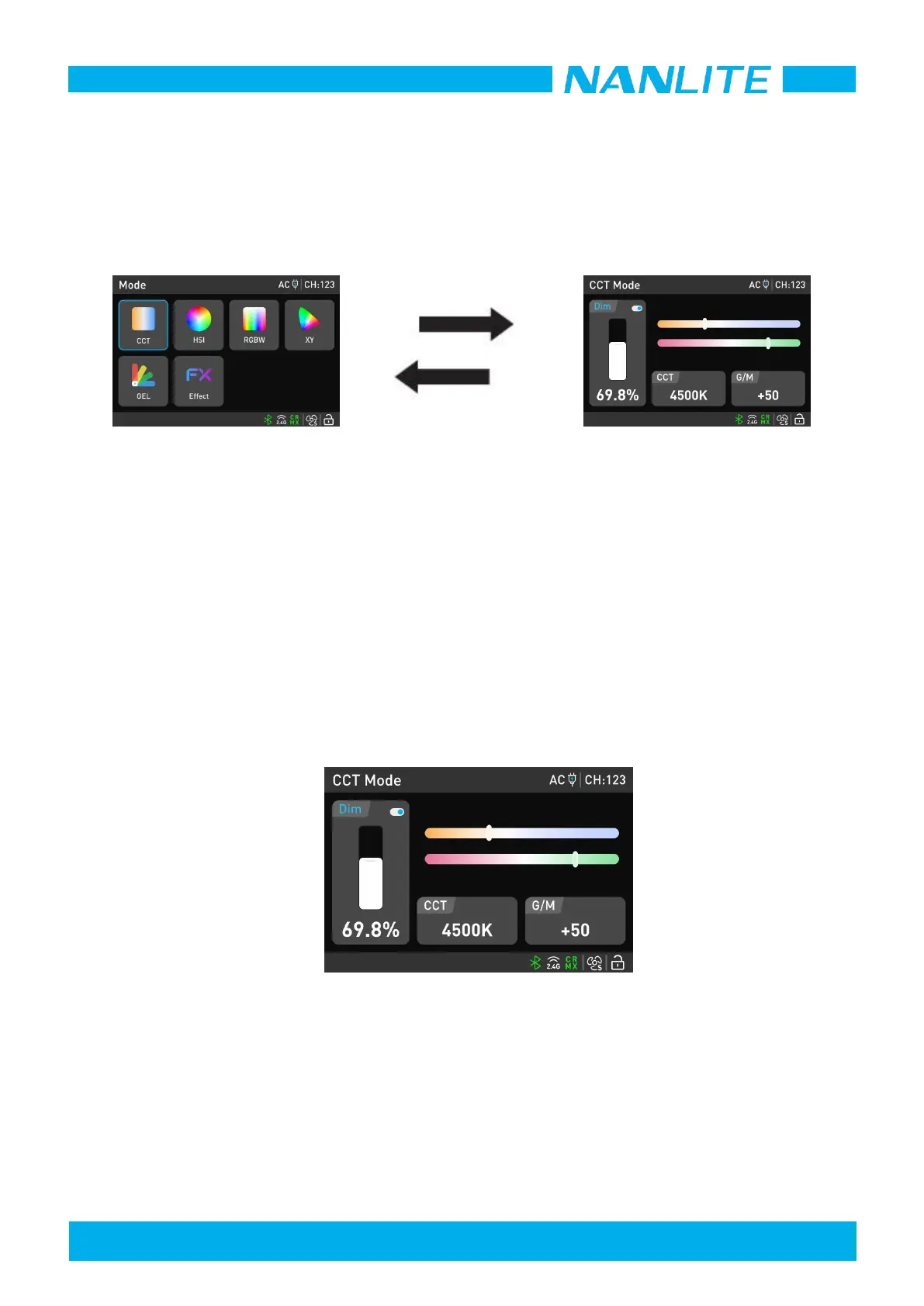 Rotate the middle knob to adjust the CCT. Press the middle knob to toggle among 2700K, 3200K, 4300K, 5600K,