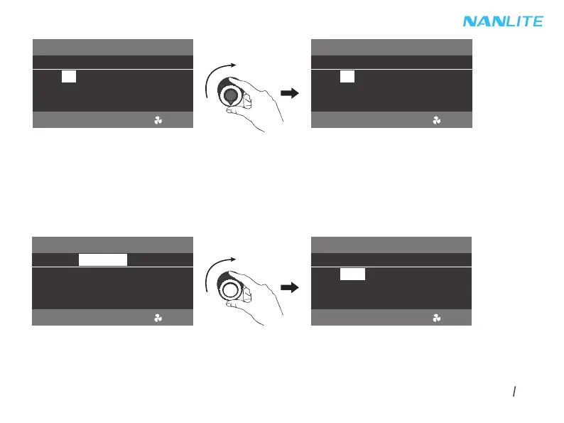Rotate the right knob to select DIM, CCT, G/M or SPEED (range: 1-100), and rotate the left knob to set the