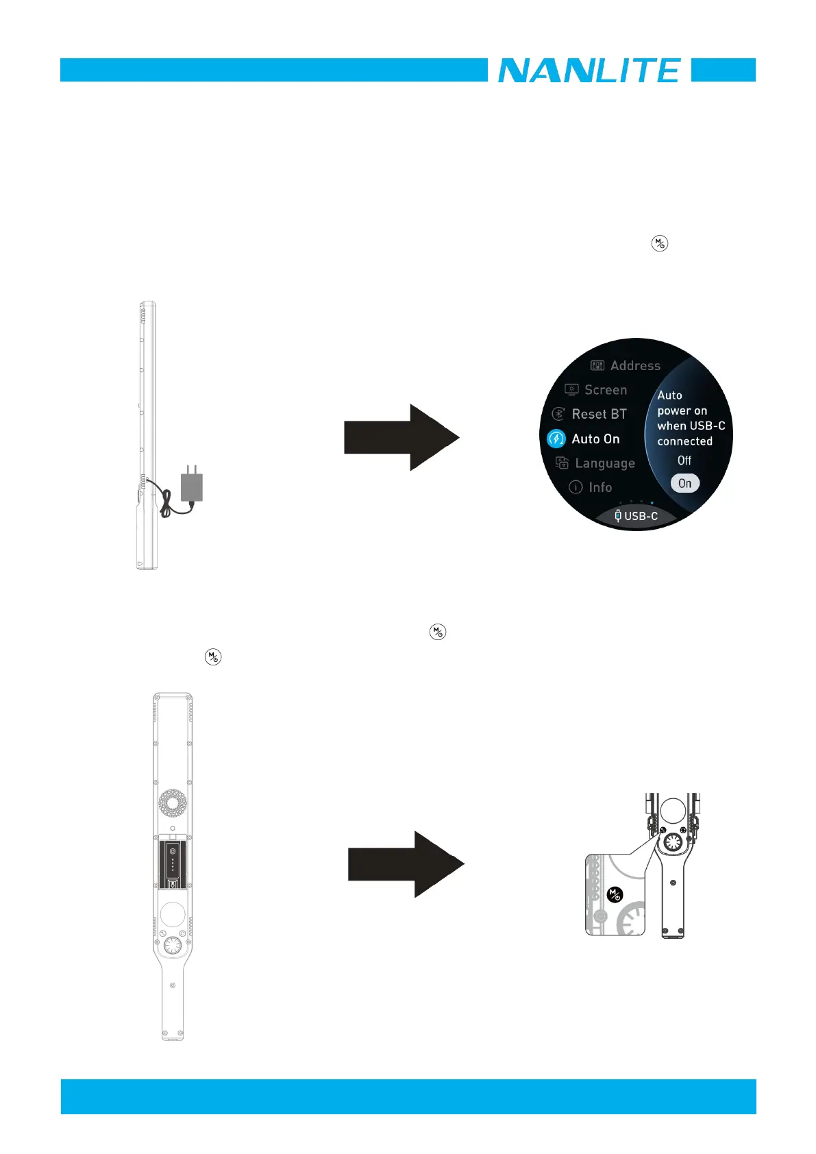 ①The fixture can be powered by a charger or power bank. When“Auto On”is set to on, the fixture will power on