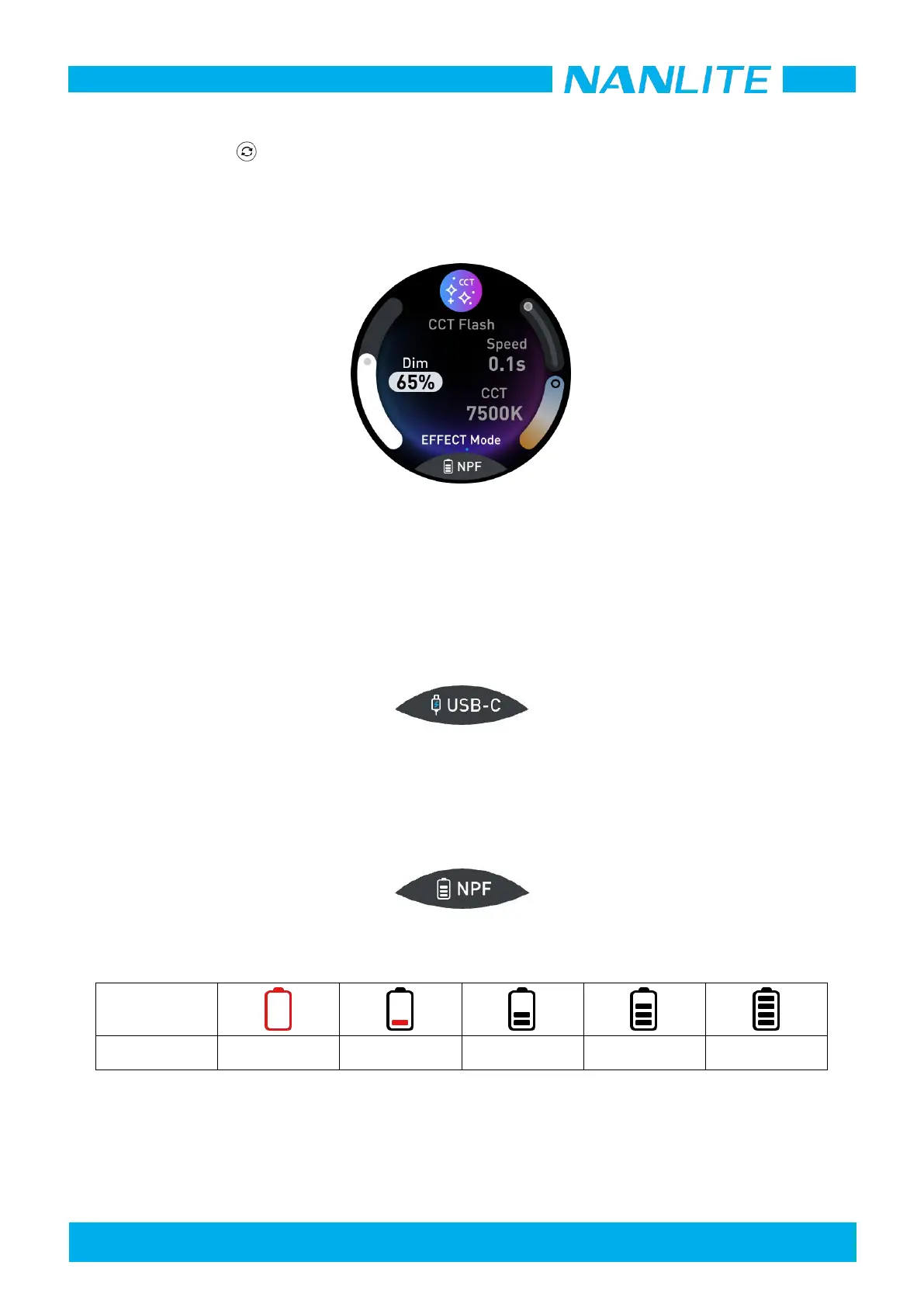 When the fixture is powered by an NP-F battery, a battery icon will appear in the status bar at the bottom of the