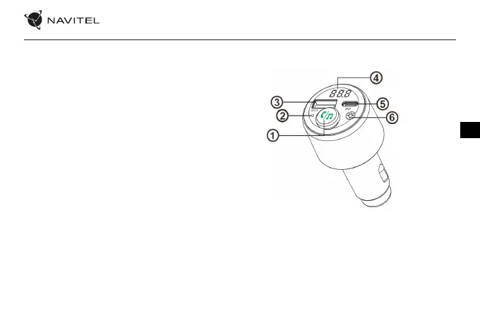 NAVITEL BHF05 MAX – FM transmitter with Hands Free function, capable of playing audio les from external media via Bluetooth or FM.
