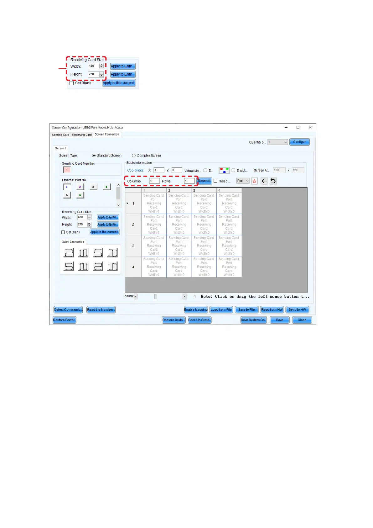 (1) With a pixel pitch of 1.25 mm, enter Width=480 and Height=270 under “Receiver Card Size” (e).