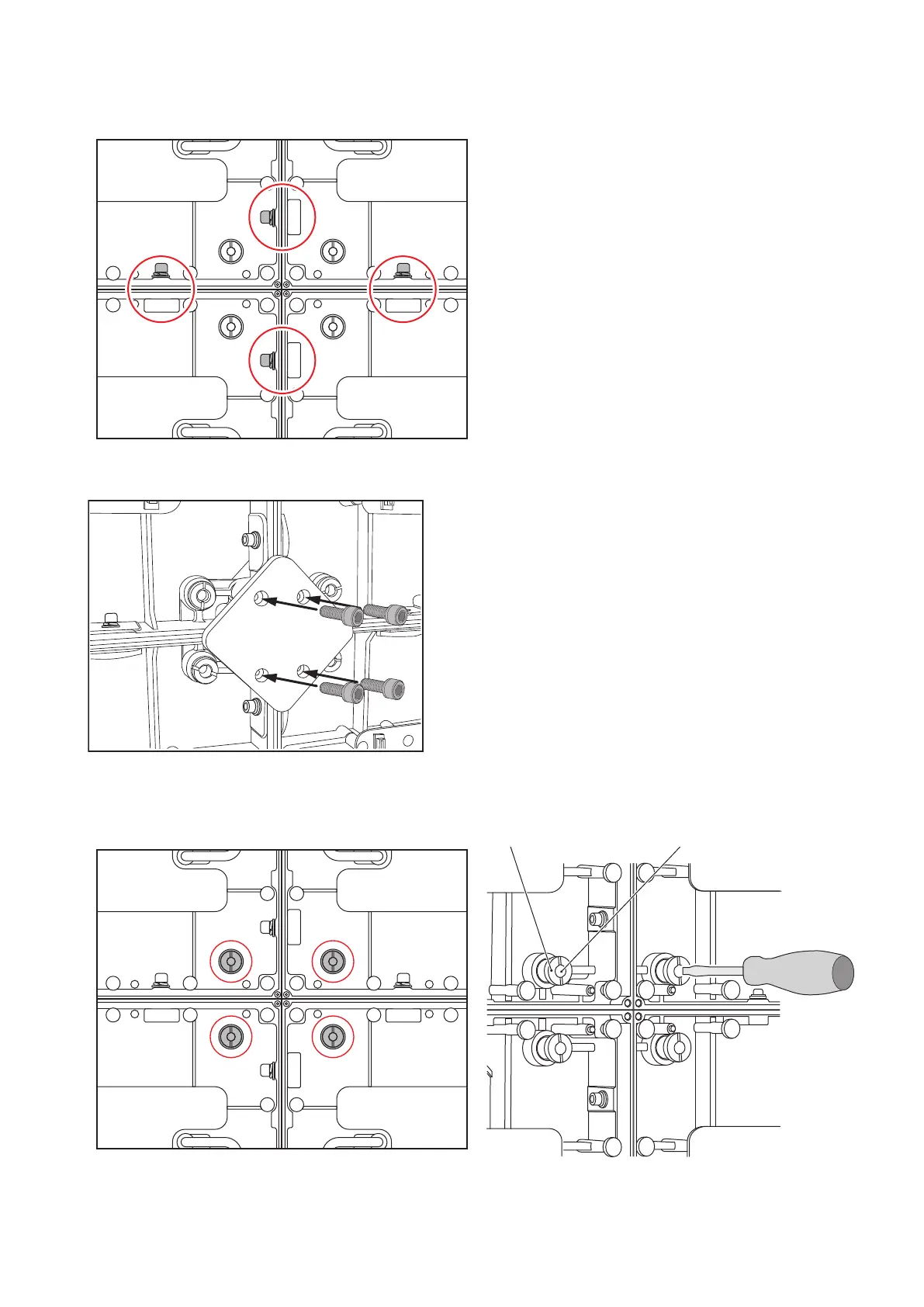 Secure the LED cabinets together using screws for connecting cabinets. Do not tighten the screws completely.