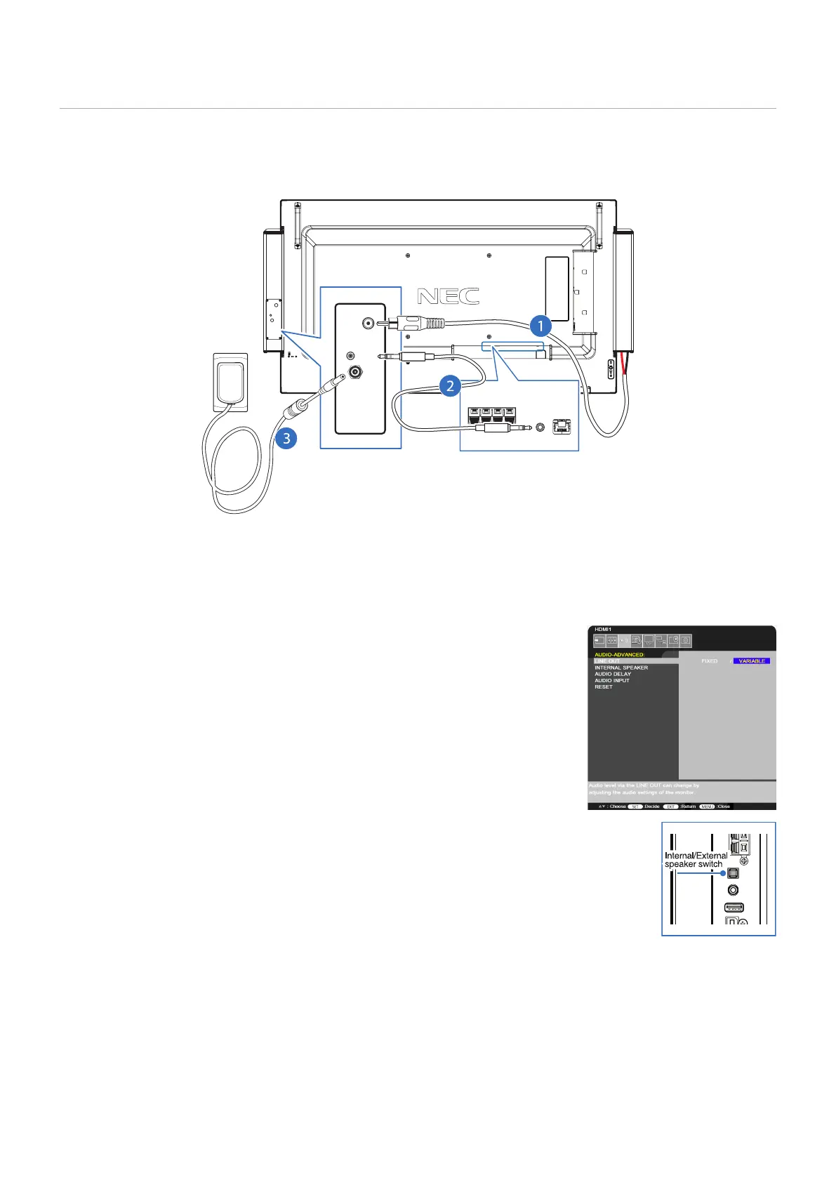 • The monitor automatically detects the external speaker; you do not need to