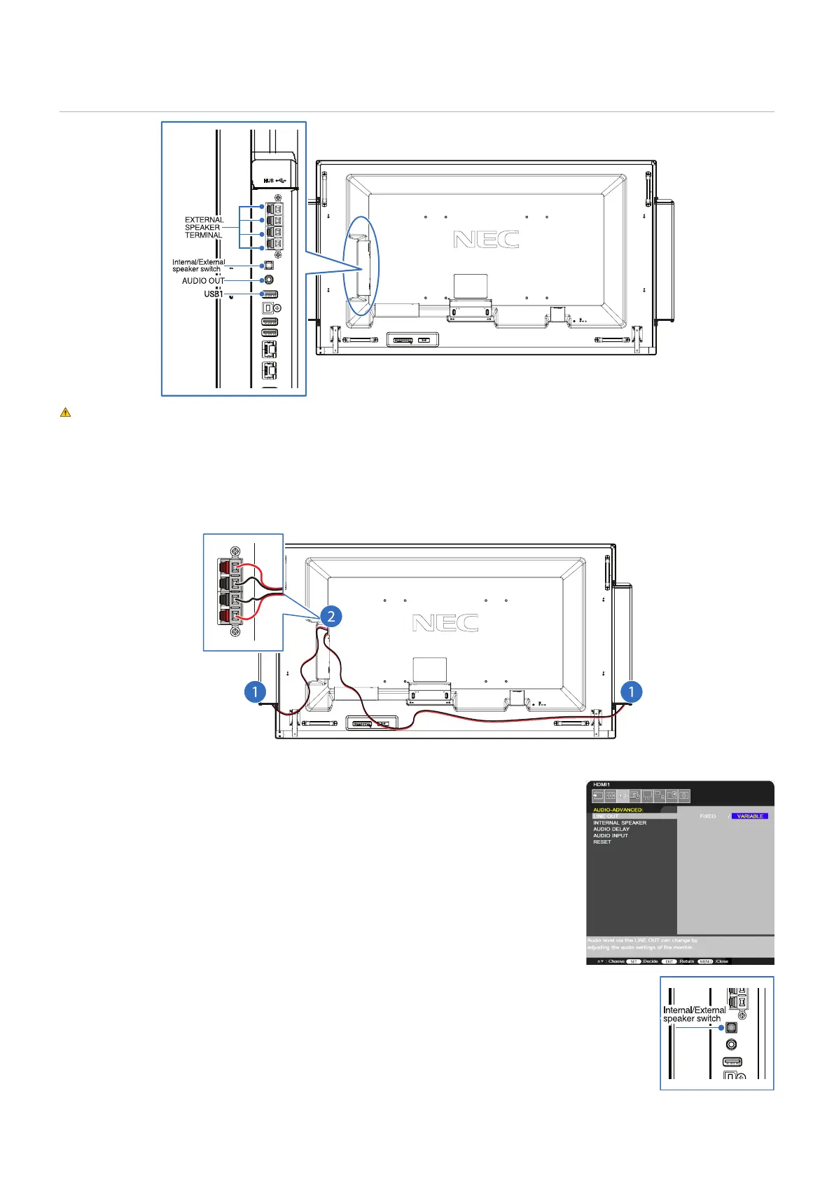 • The monitor automatically detects the external speaker; you do not need to