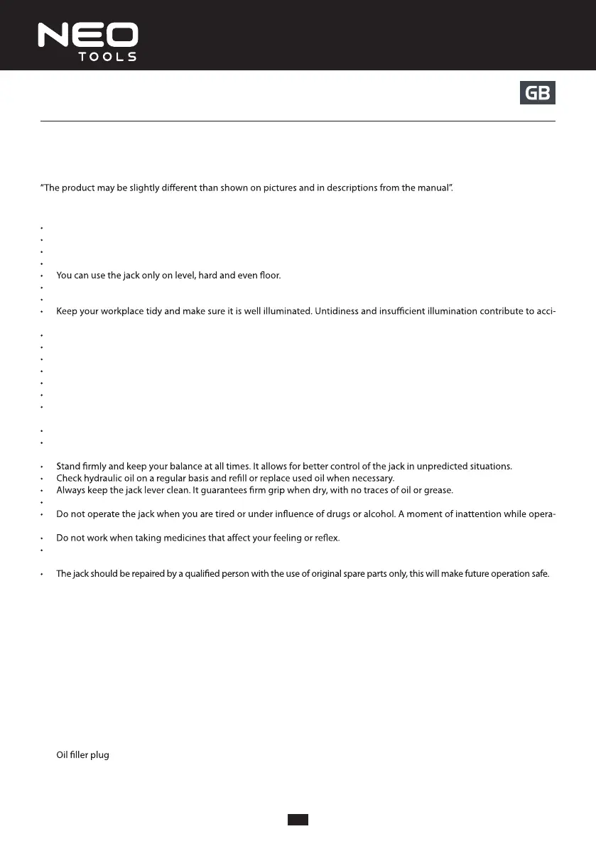 Warning: The jack is designed only for lifting. Surface the jack is placed on should be even, hard and level. Before starting to
