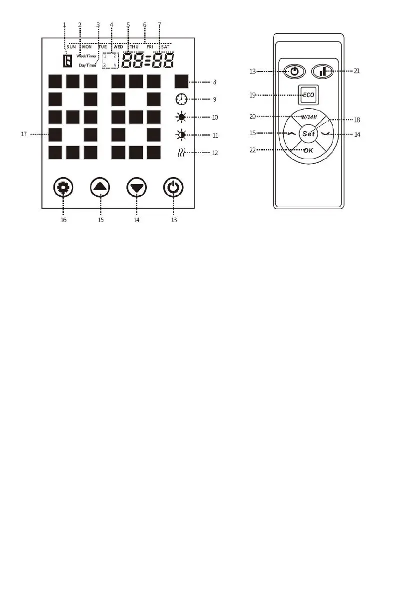 Drücken Sie die Tasten der Einstellungen 16 und 15 gleichzeitig 3 Sekunden lang, die Wochenanzeige „6“ blinkt und die Zeiteinstellung ist