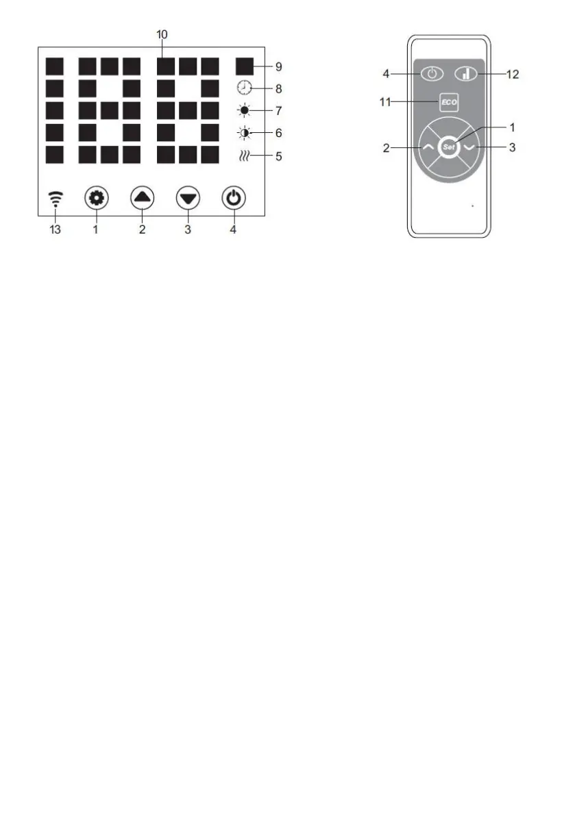 −En mode de fonctionnement , touche 12 quarts de travail entre Off / bas / haut chauffage , 7 rallume en chauffage haute , 6 lumière en feu