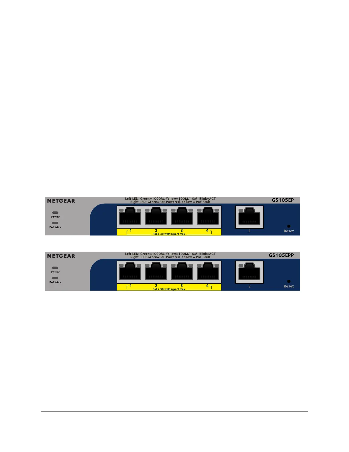 On models GS105EP and GS105EPP, ports 1 through 4 are PoE+ ports. Port 5 is an