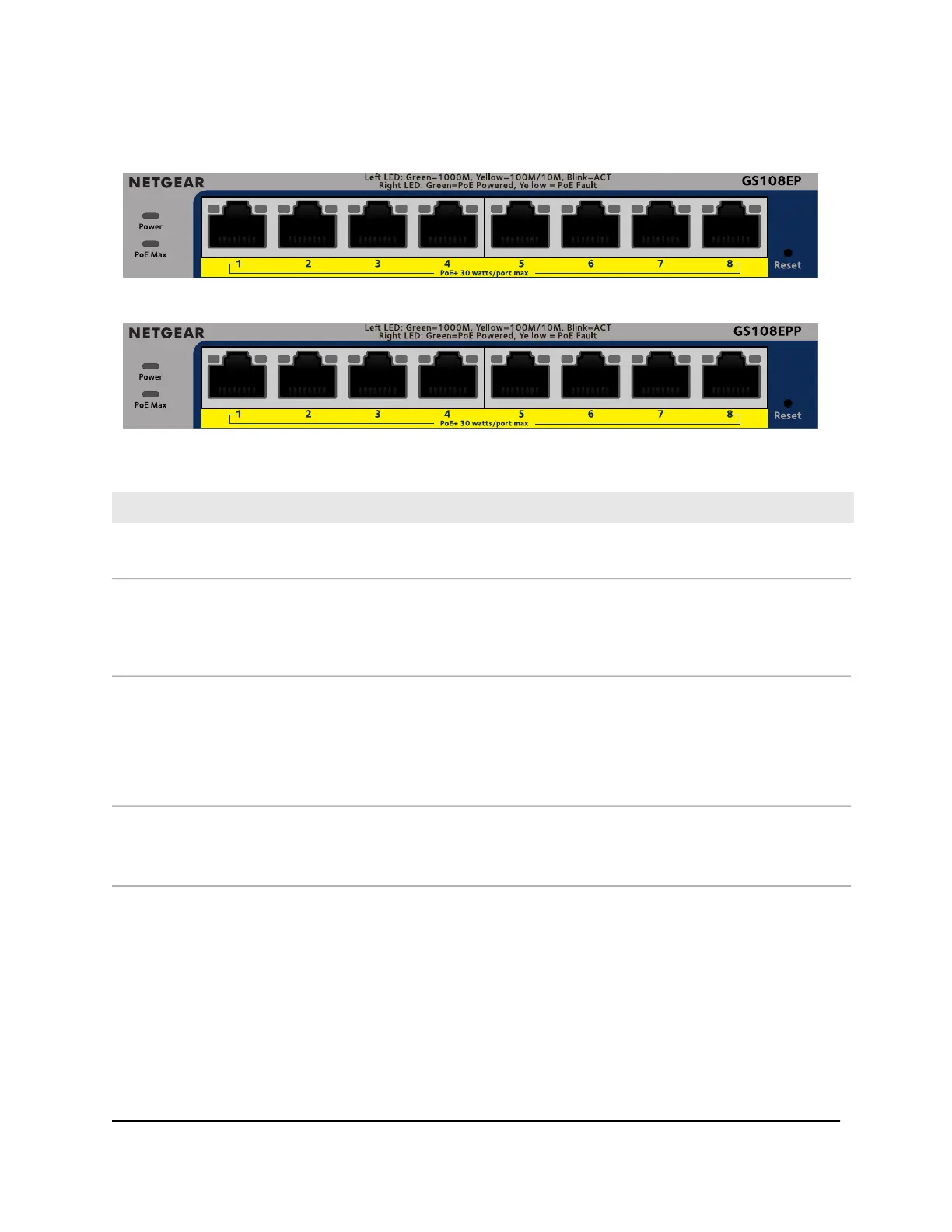 Table 2. Model GS105EP, GS105EPP, GS108EP, GS108EPP LEDs on the front panel