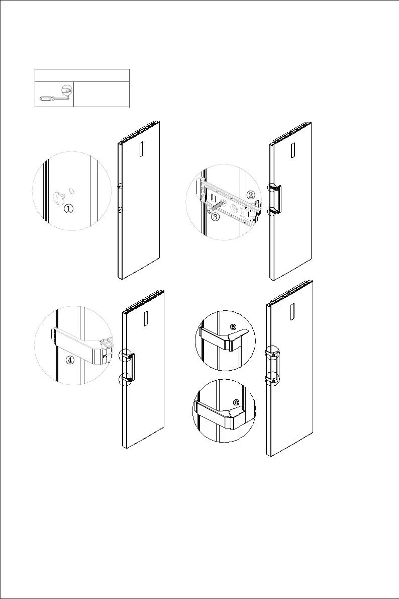 a. Remove the screw hole caps ① from the door, and use cross screwdriver to fix screws ③