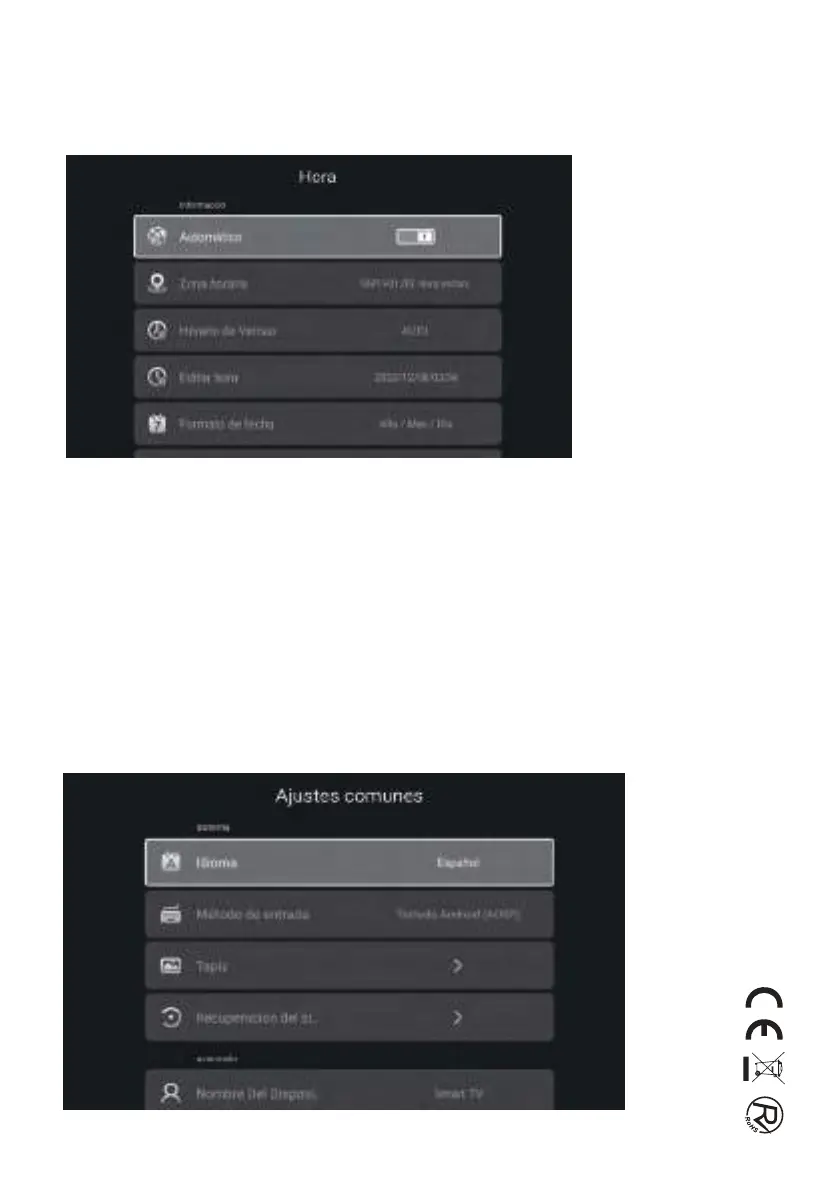 hora/Formato de fecha/24 horas/Hora del protector de pantalla/Temporizador de apagado.