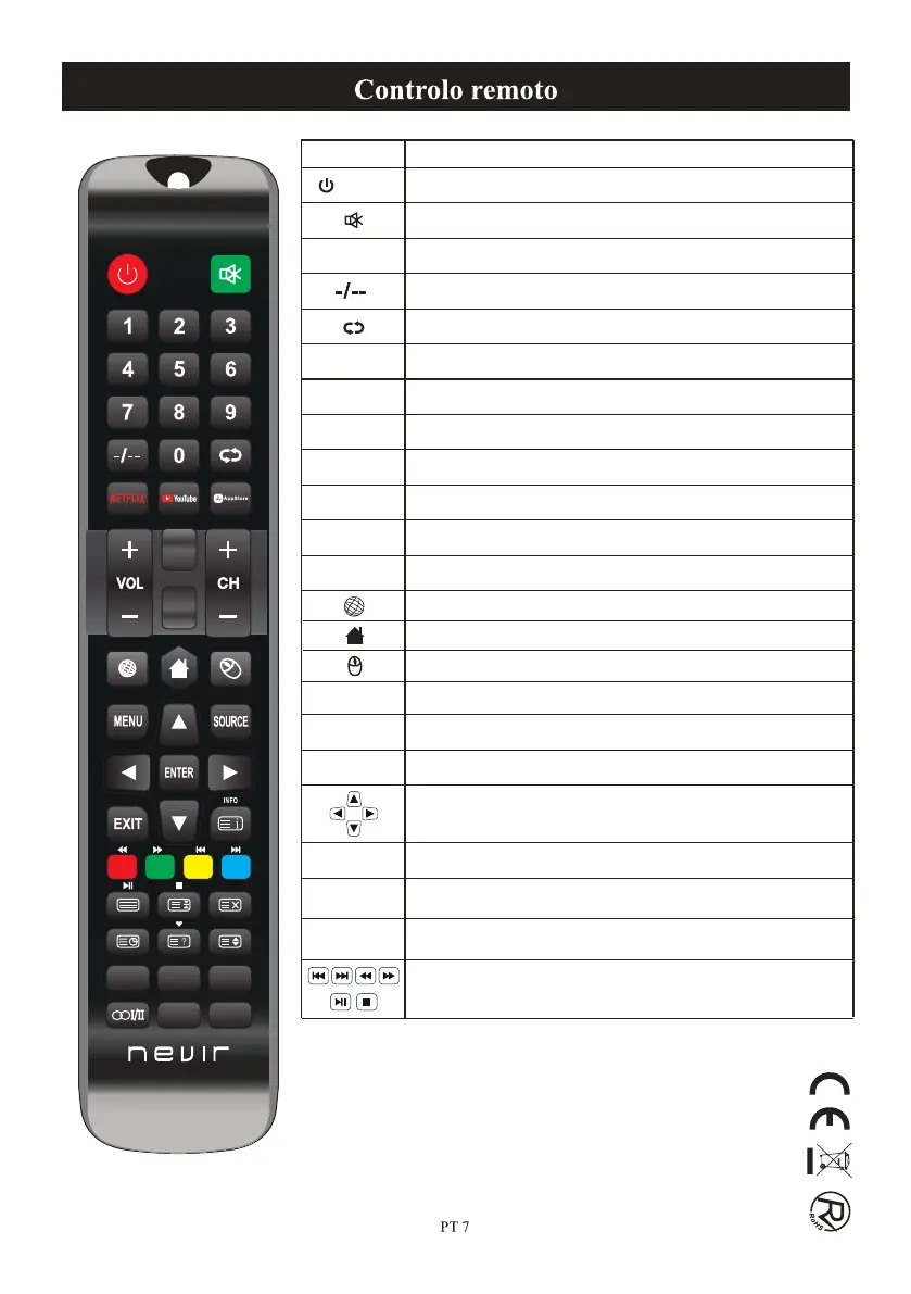 Inclui reproduzir/pausar, parar, retroceder, avançar, próximo, anterior