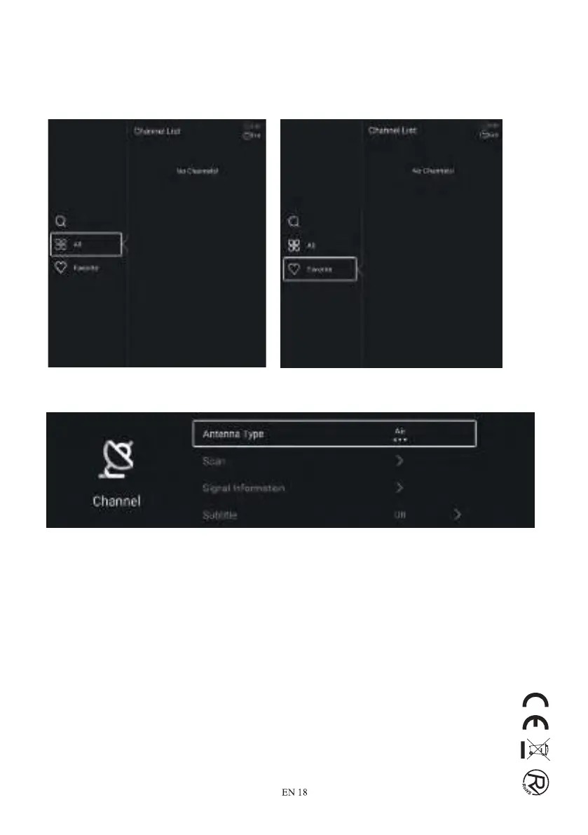 Press / button to select Antenna Type/Scan/Signal Information/Subtitle/Channel List/ EPG/CI Card.