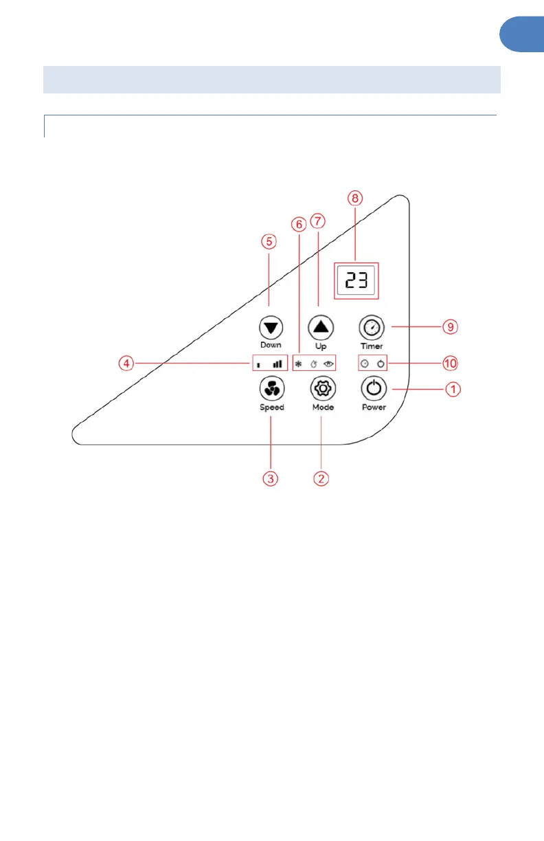 MODE: Press to switch operating mode between fan, cooling, heating, and