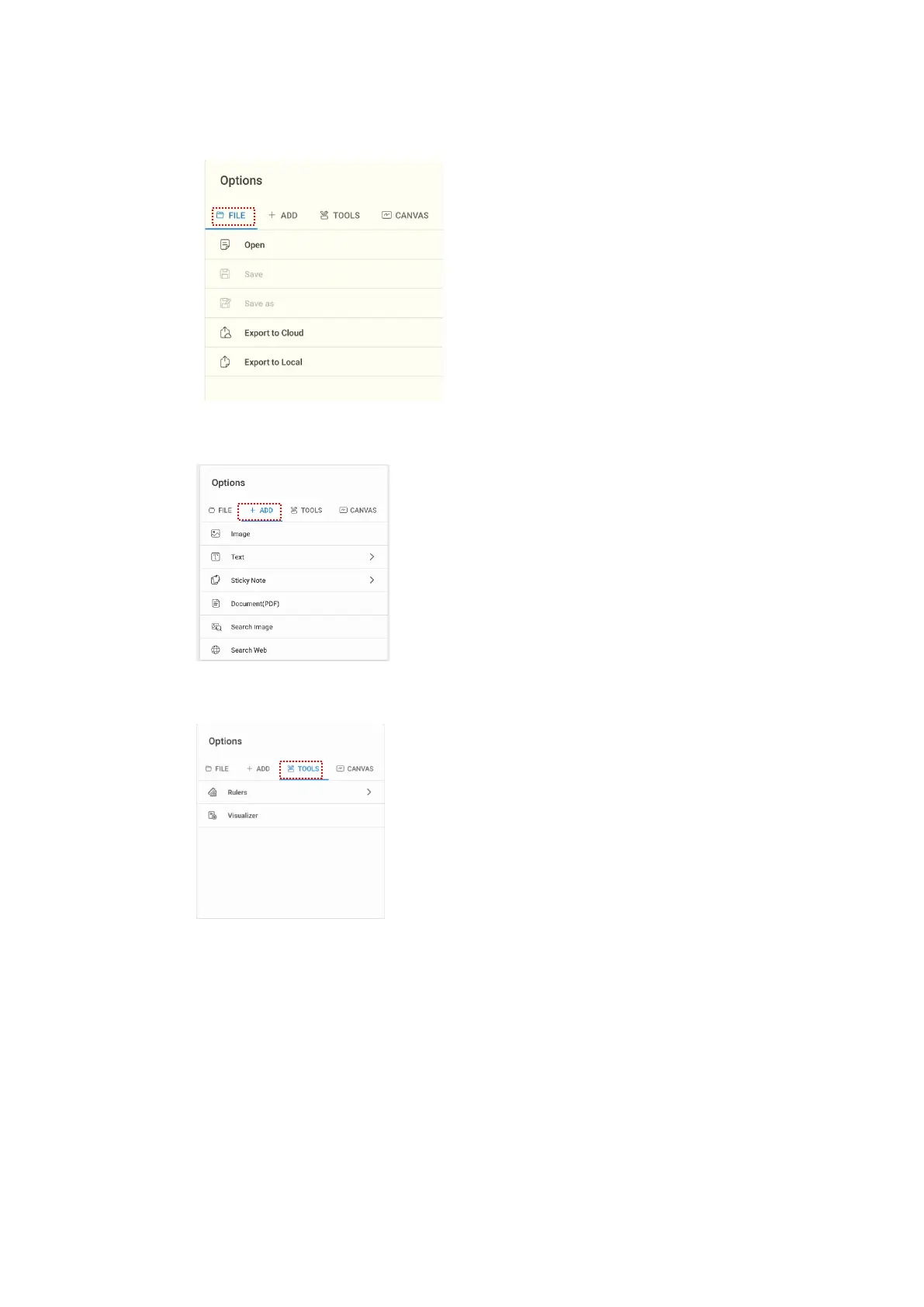 On the FILE items, you can import data from file management, save whiteboard files and export