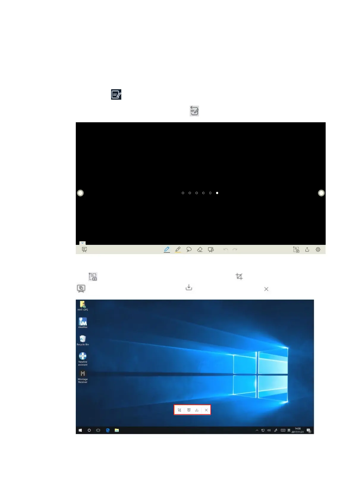 icon to switch to whiteboard mode; tap icon to save screenshot, tap icon to exit screenshot.