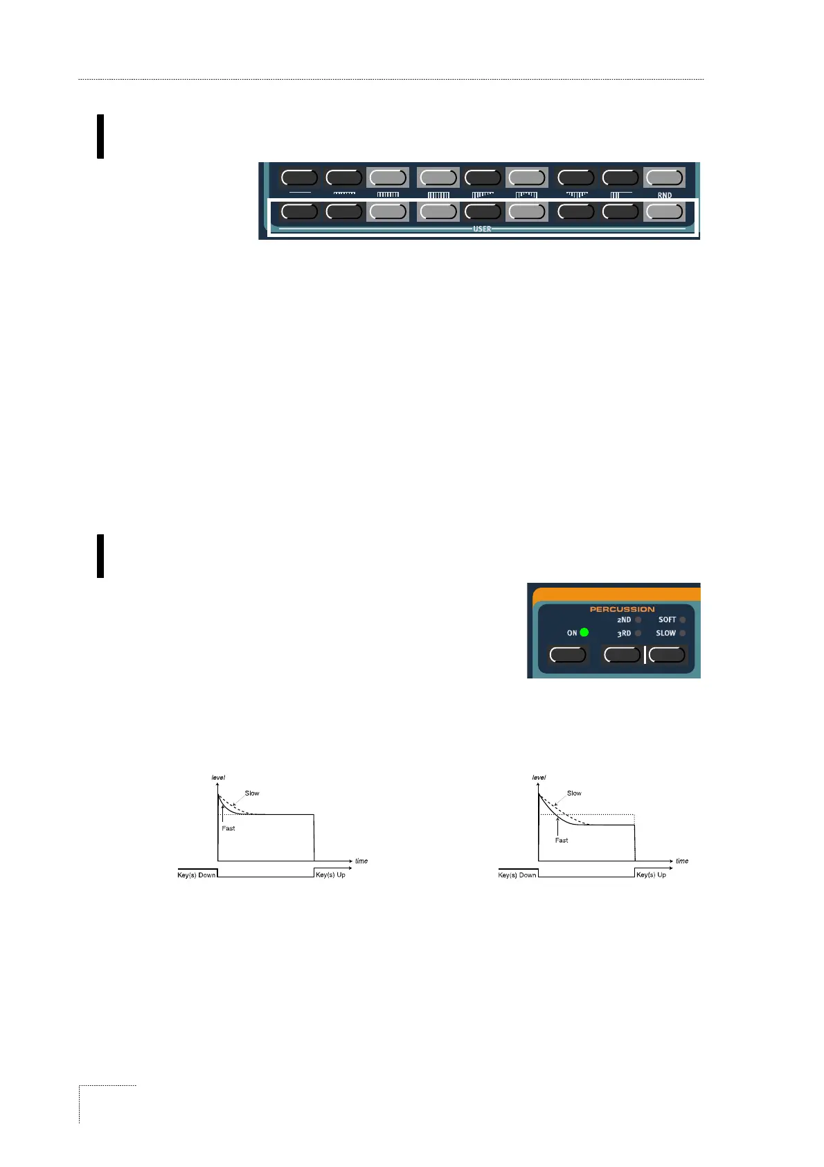 オリジナルの B-3 と同様、Nord Electro のパーカッショ ンは、シングルトリガー/ポリフォニック