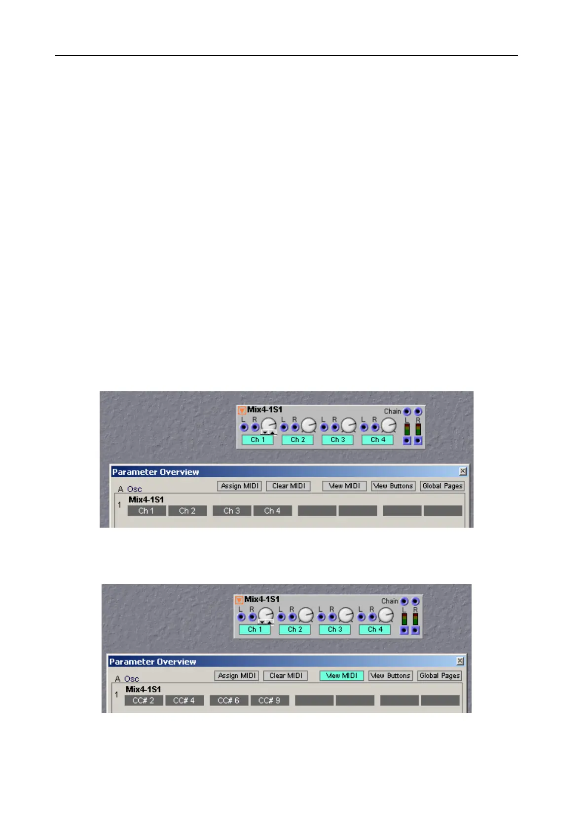 Parameter Overview window. Look at the next picture where four mixer knobs are assigned to four panel
