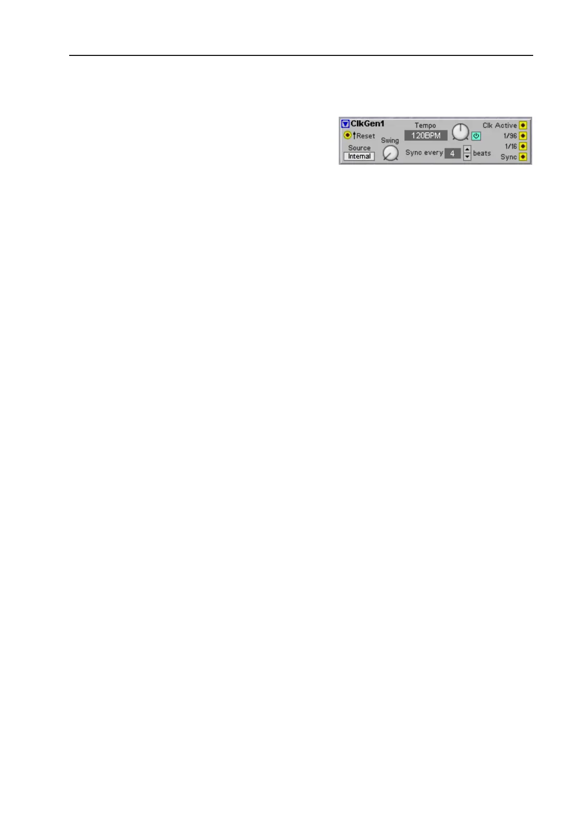 Here you set the interval for sending a logic pulse on the Sync output of the Clock Generator module.
