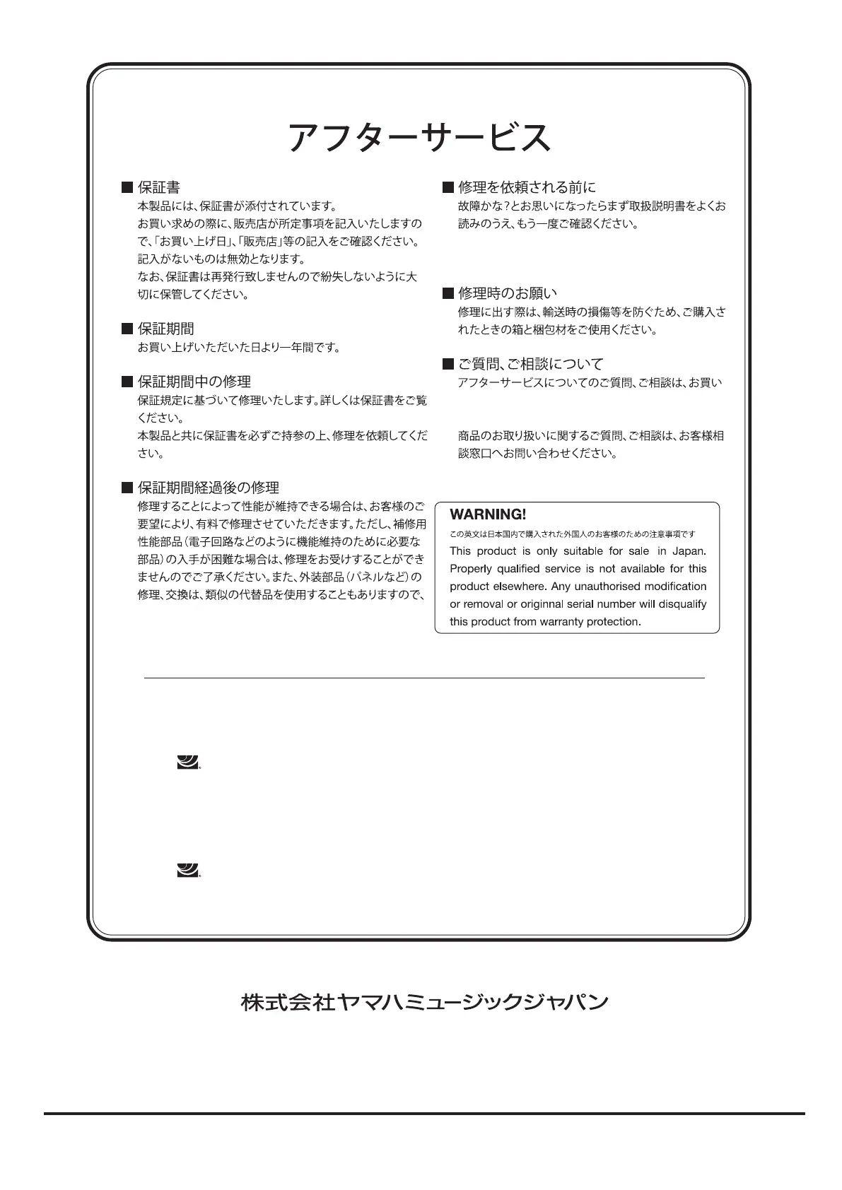 あらかじめお買い上げの販売店、またはヤマハ修理ご相談