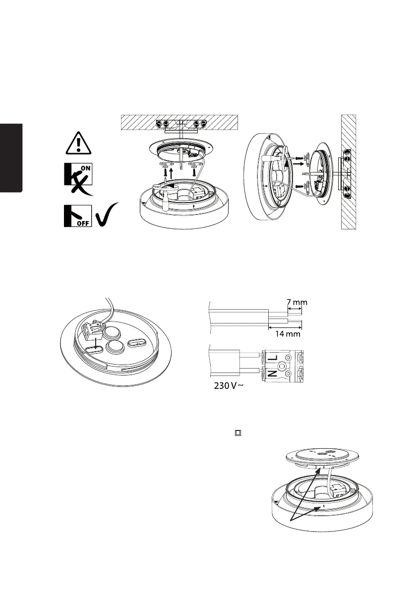 6. Tryck plafonden mot fästet så att märkningarna (7)