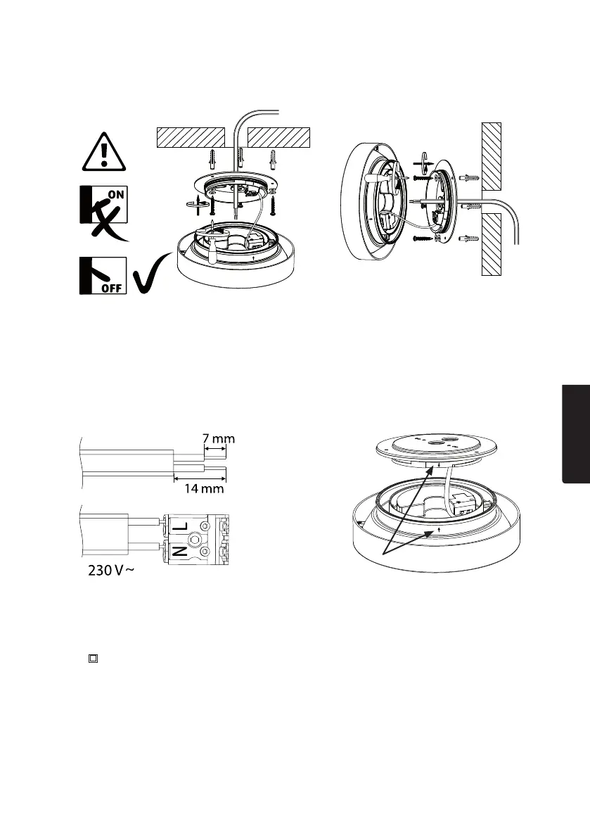 3. Vedäsisääntuleva kaapeli tiivistystulpan (4)läpi. Asenna tiiviste (2) plafondiin (1).