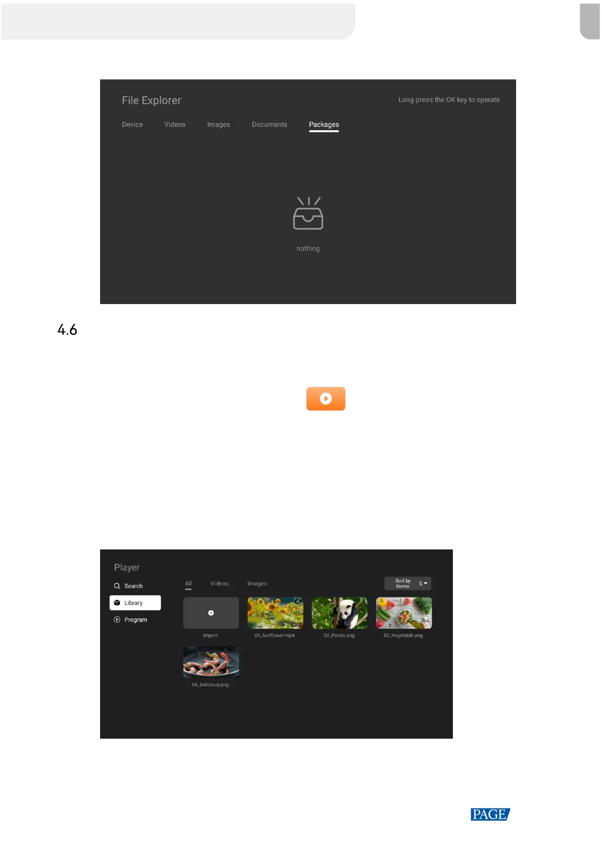 Step 3 To import new media files, select Import, select a file, and then press the Confirm button