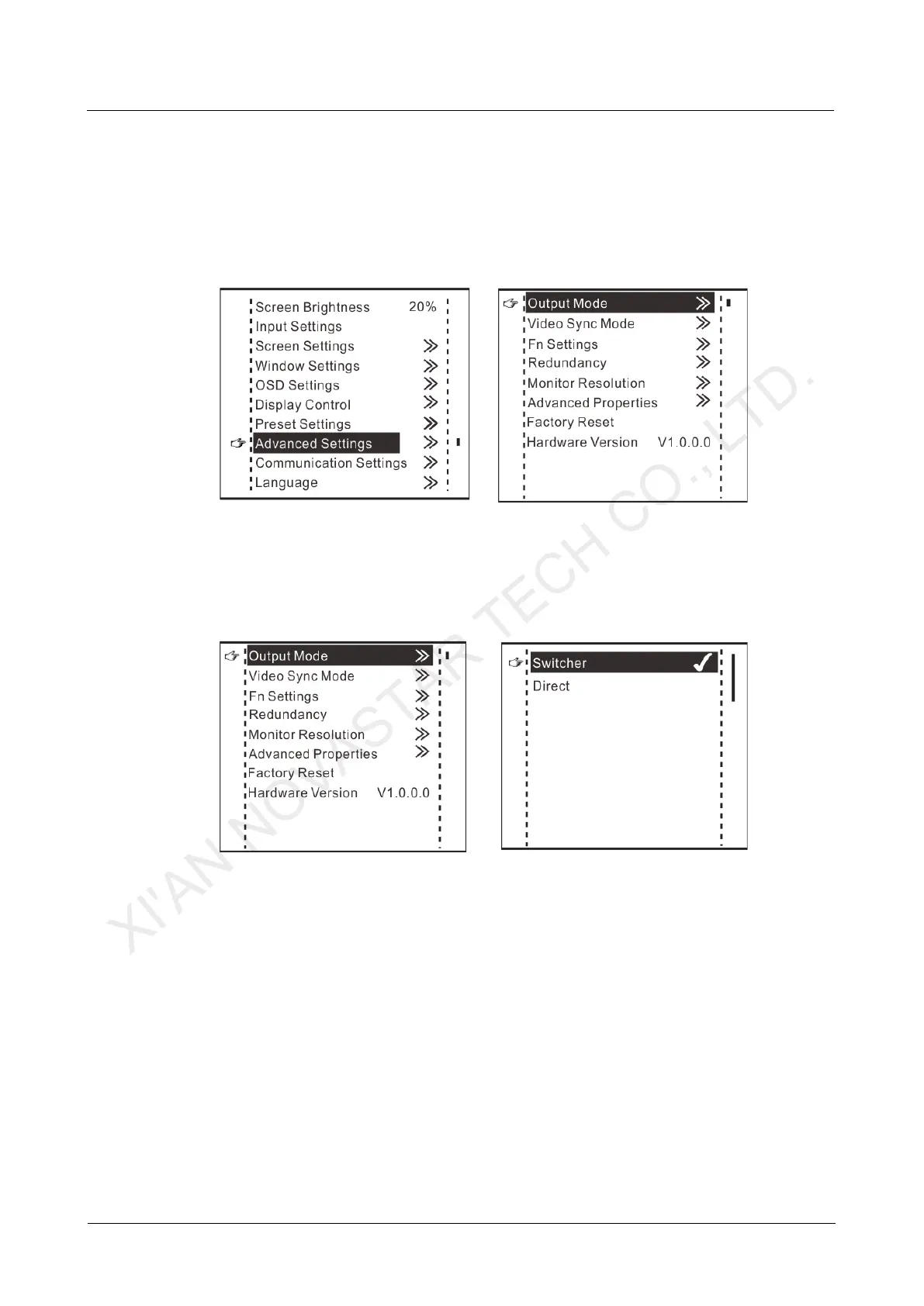 be set as black out, freeze, test pattern, output mode, and preset. After setting, when
