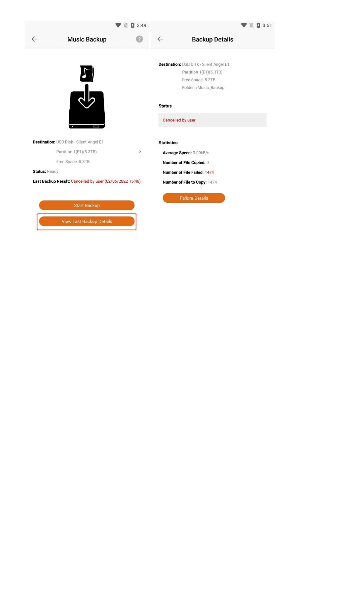 Click " Failure Details " to view the " Music Backup Failed File List ".