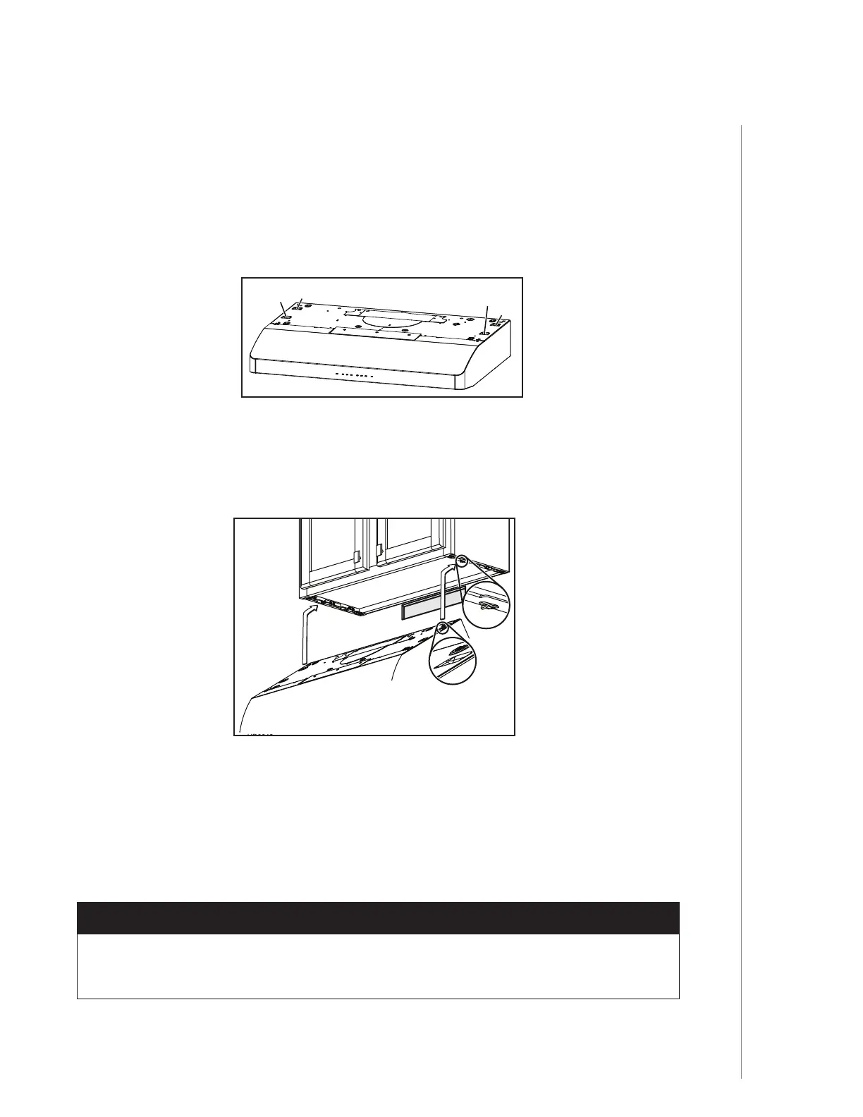 3 ] Accrocher temporairement la hotte aux supports, uniquement par les (2) TROUS ENFONCÉS