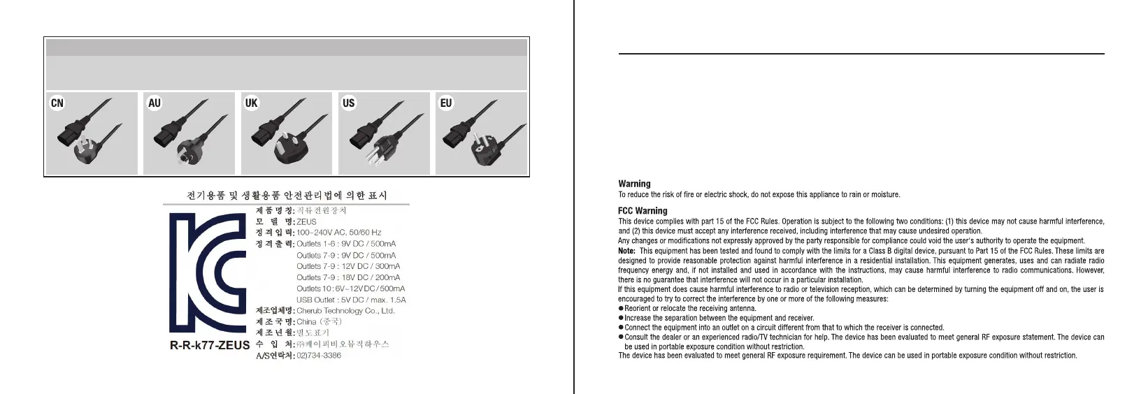 제품에는 대한민국에서 사용할 수 있는 AC 전원 케이블이 포함되어 있습니다.